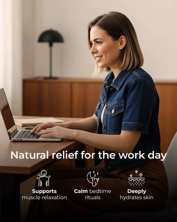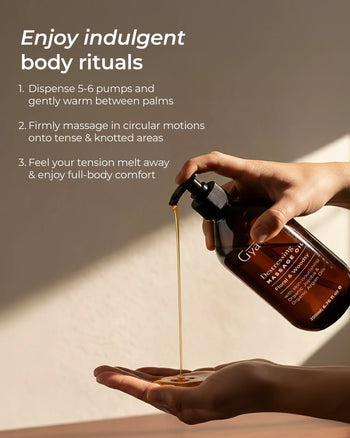 To use our Destressing Massage Oil, simply apply 1-2 pumps of the massage oil between hands, rub your hands together to warm up the oil, and massage onto desired areas.