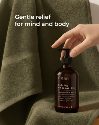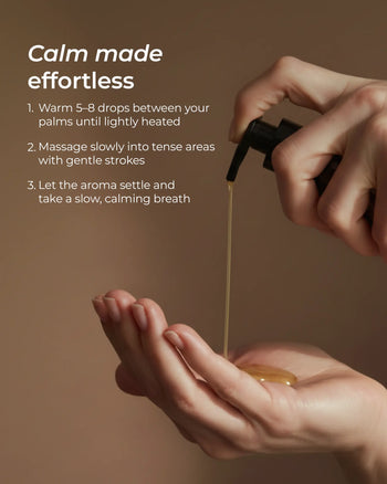 To use our Calming Massage Oil, simply apply 1-2 pumps of the massage oil between hands, rub your hands together to warm up the oil, and massage onto desired areas.
