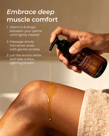 To use Gya Labs' Relaxing Massage Oil, simply apply 1-2 pumps of the massage oil between hands, rub your hands together to warm up the oil, and massage onto desired.