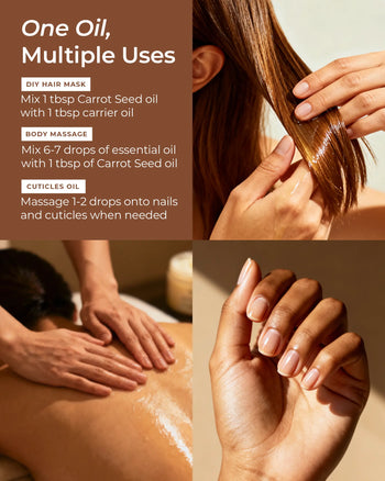 Organic Carrot Seed Carrier Oil infuses moisture and provides essential nutrients to your skin when applied topically. It helps in soothing dry or irritated skin to give your complexion a healthy glow.