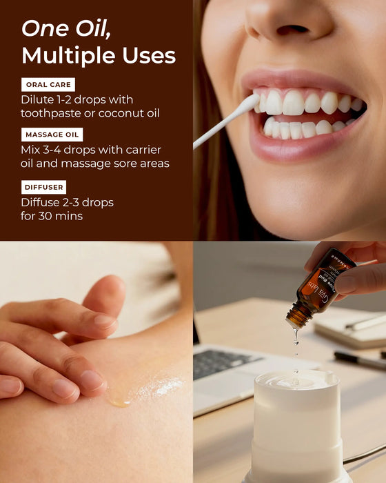 Dilute about 1-2 drops of essential oils for every tablespoon of our skin-friendly Carrier Oils, apply topically to warm and relax your muscles. For soothed gums, dilute 1-2 drops of essential oils in water and rinse in mouth for bright, confident smiles.