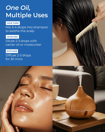 Dilute about 1-2 drops of essential oils for every tablespoon of our skin-friendly Carrier Oils, apply topically for clean and soothed skin. Diffusing the calming oil also soothes the mind before bedtime for sweeter slumbers.