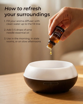 Pine Needle Essential Oil can be disused in a closed room and its woody balsamic aroma can be deeply inhaled to have a grounding effect.