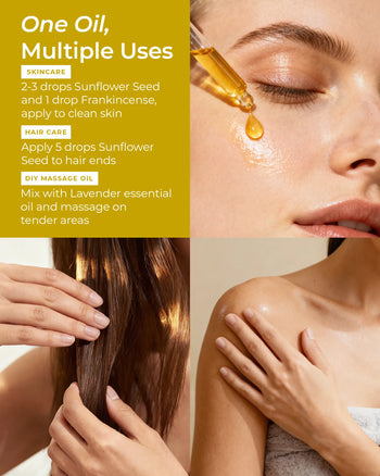 Organic Sunflower Seed Carrier Oil has an abundance of soothing ingredients to comfort dry, breakout-prone skin. It also keeps your hair hydrated to tame flyaways and frizzy hair.