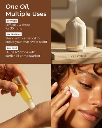 Dilute about 1-2 drops of essential oils for every tablespoon of our skin-friendly Carrier Oils for a sweet and calming scent; apply topically for naturally scented skincare.