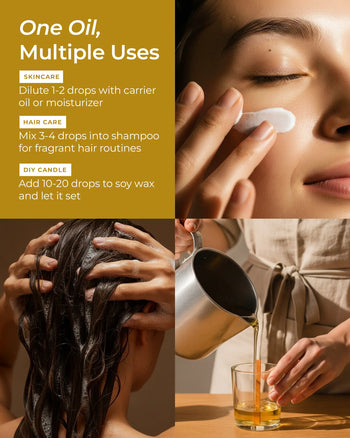 Dilute about 1-2 drops of essential oils for every tablespoon of ourskin-friendly Carrier Oils, massage into hair for full-volumed tresses.